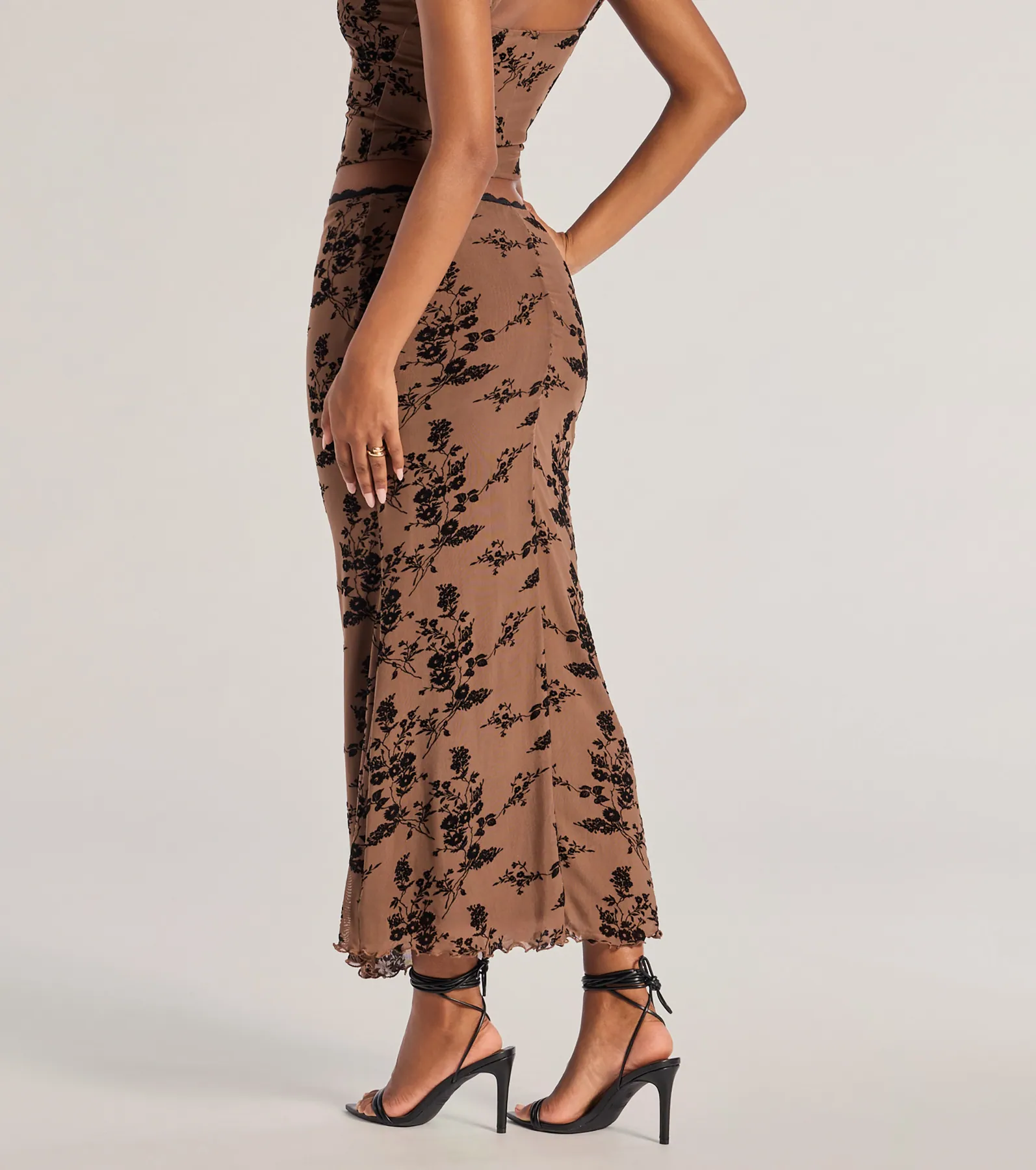 Romantic Aura Flocked Floral Mesh Maxi Skirt