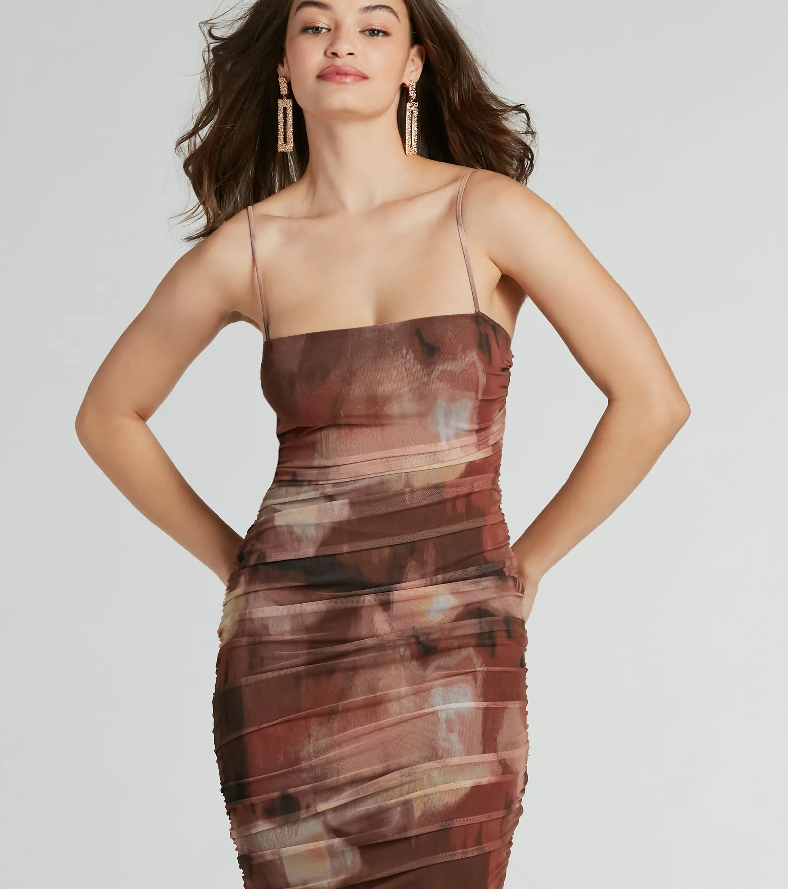 Let your look do the talking in this mesh midi dress! With an eye-catching abstract print and adjustable spaghetti straps. this midi dress will show off your style while the bodycon fit and side-ruched seams enhance your curves. Complete the look in trendy mules for an art show downtown!