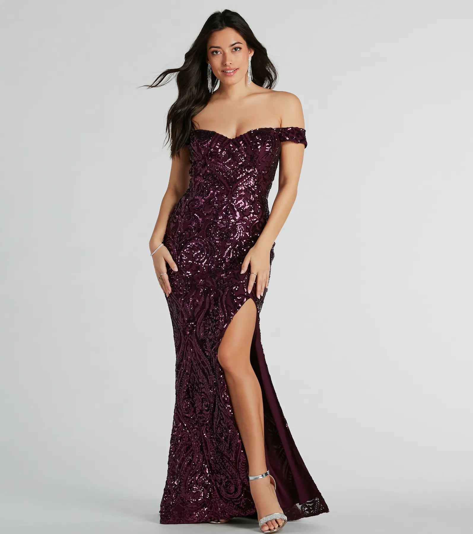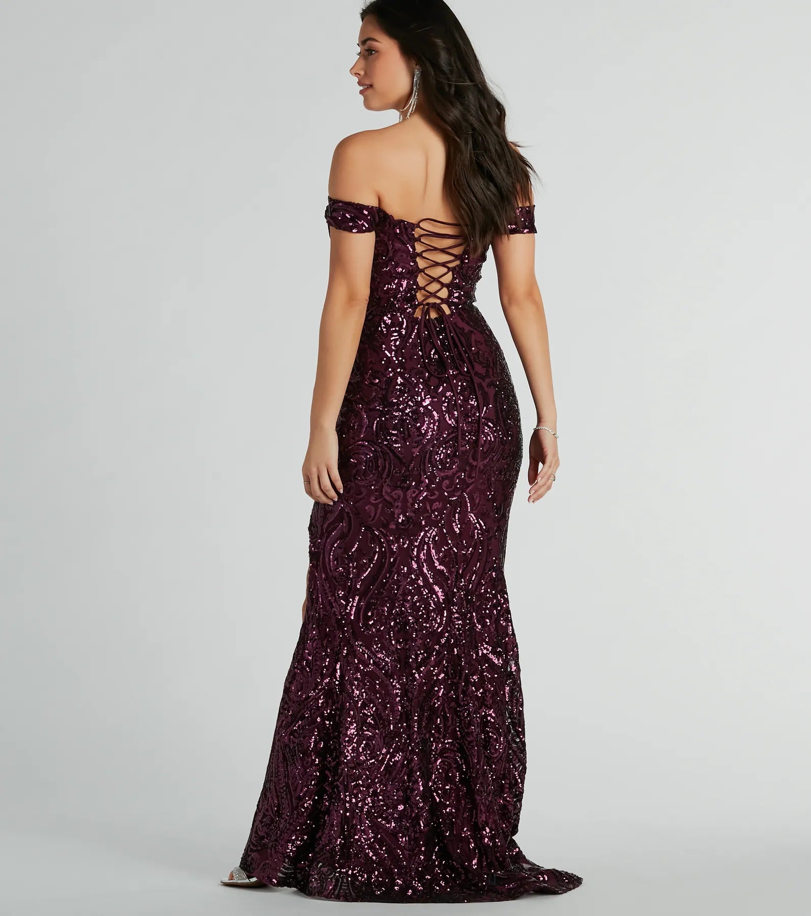 Exude luxury in the stunningly chic Alanna off-the-shoulder sequin mermaid dress at your next black-tie affair. The lined mesh fabric is accented with gorgeous shimmering sequin embroidery in an intricate scroll pattern for a stunning look. She is shaped with an off-the-shoulder sweetheart neckline, short-sleeved cuffs and padded bra cups for support. Her customizable lace-up strappy back design allows you to find your perfect find and adds a sultry allure. The curve-hugging mermaid silhouette is detailed with a high-cut front slit to showcase some leg along her bonded floor-length hem. Complete your formal look with rhinestone chandelier earrings and stiletto heels.