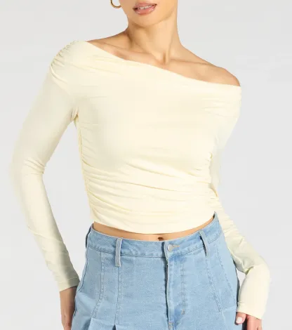 Up your going-out looks and beyond in this one-shoulder crop top with a trendy tie-back design and a fitted silhouette that flaunts your figure! Pair with your fave bottoms.