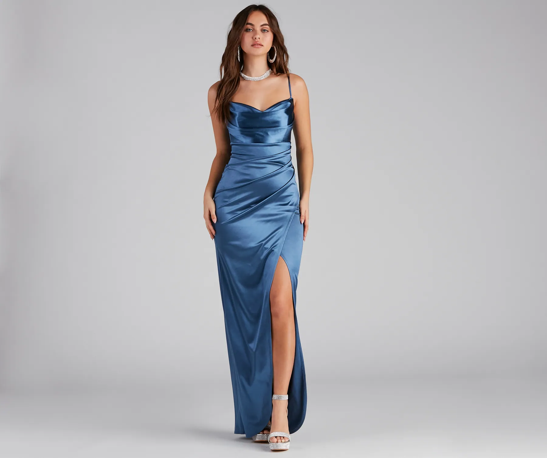 Wrap yourself in the sleek and stunning Annabelle knit satin formal dress for effortless glamour! She features a sleeveless cowl neckline with a padded bust. adjustable spaghetti straps for a customized fit. front ruching at the waist. and a floor-length. wrap-front skirt with a fitted A-line silhouette. Style this long dress with sparkling rhinestone earrings.
