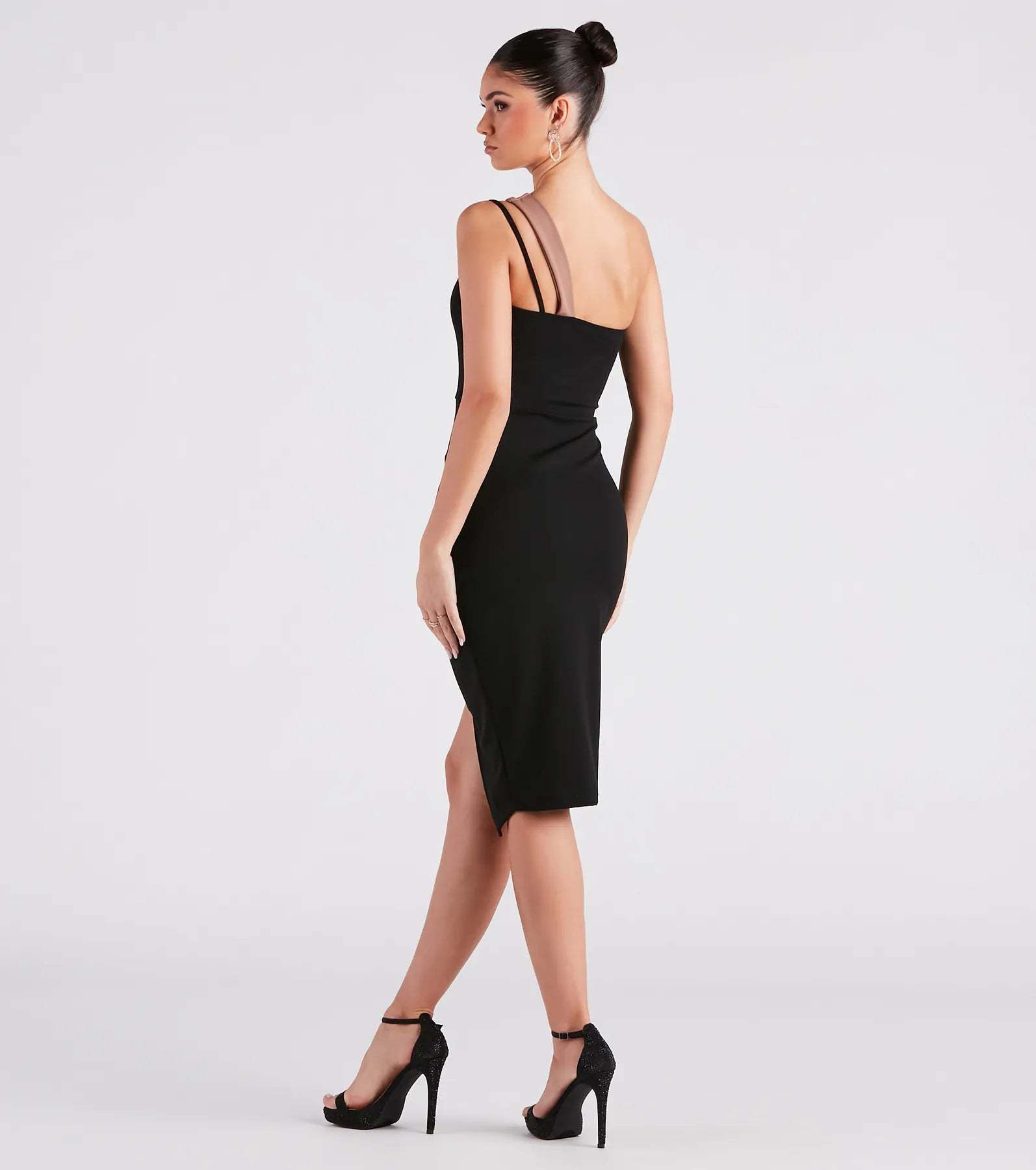 Let your body do the talking in this curve-flaunting bodycon midi dress for a night out! It features a sleeveless one-shoulder neckline, dual shoulder straps with a cutout, a pleated side seam, asymmetrical wrap hem, and is designed with a color block pattern. Complete the look with stiletto heels.