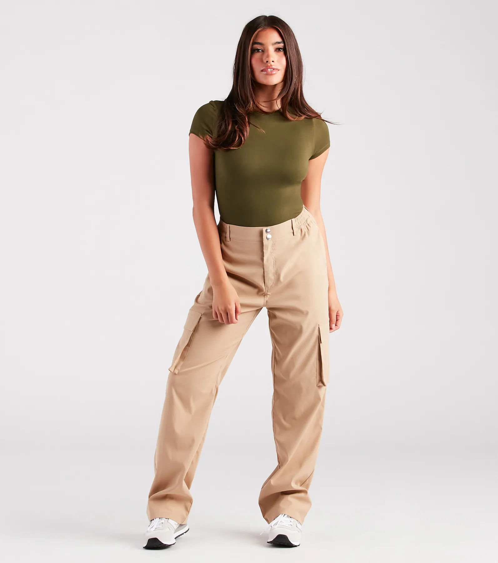 Look and feel casually cute in this basic bodysuit that makes the perfect essential! It features short sleeves. a crew neck. a form-hugging fit. and a thong bottom with dual snap-button closures. and is crafted on soft brushed knit double-lined fabric. Style with cargo pants for an on-trend look!