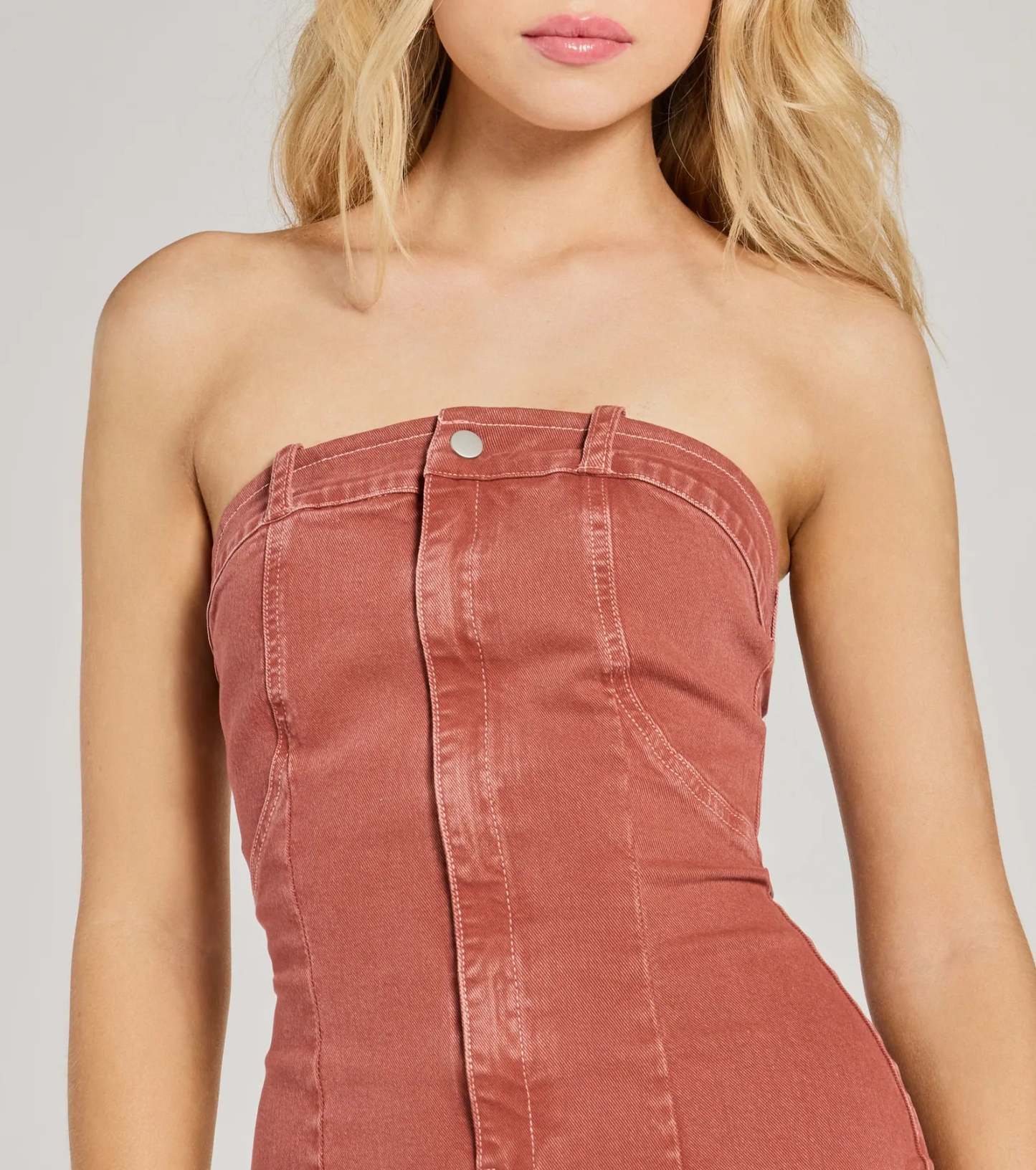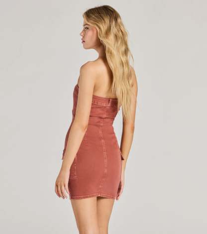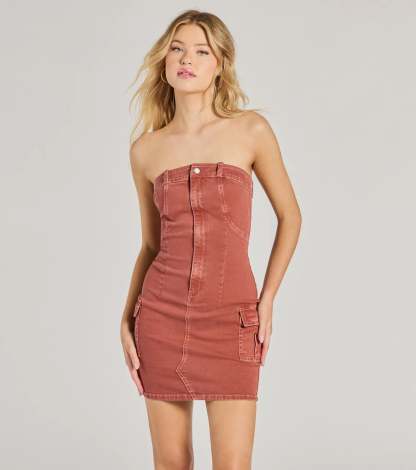 A strapless denim mini dress features a flattering bodycon silhouette with classic jean styling with pockets. Perfect for casual occasions.