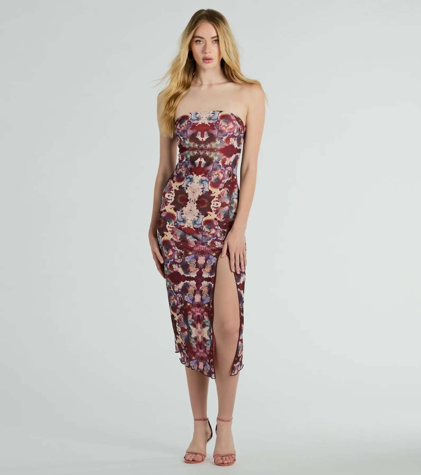 Bring a chic illusion in this artsy printed midi dress for a trend-worthy look all evening! The artsy print and mesh fabric adds a touch of sophistication, while the lined design ensures comfort and coverage. Featuring a flattering strapless neckline, front slit, and bodycon silhouette, this dress will accentuate your curves. Complete the look in stiletto sandals for an evening downtown!