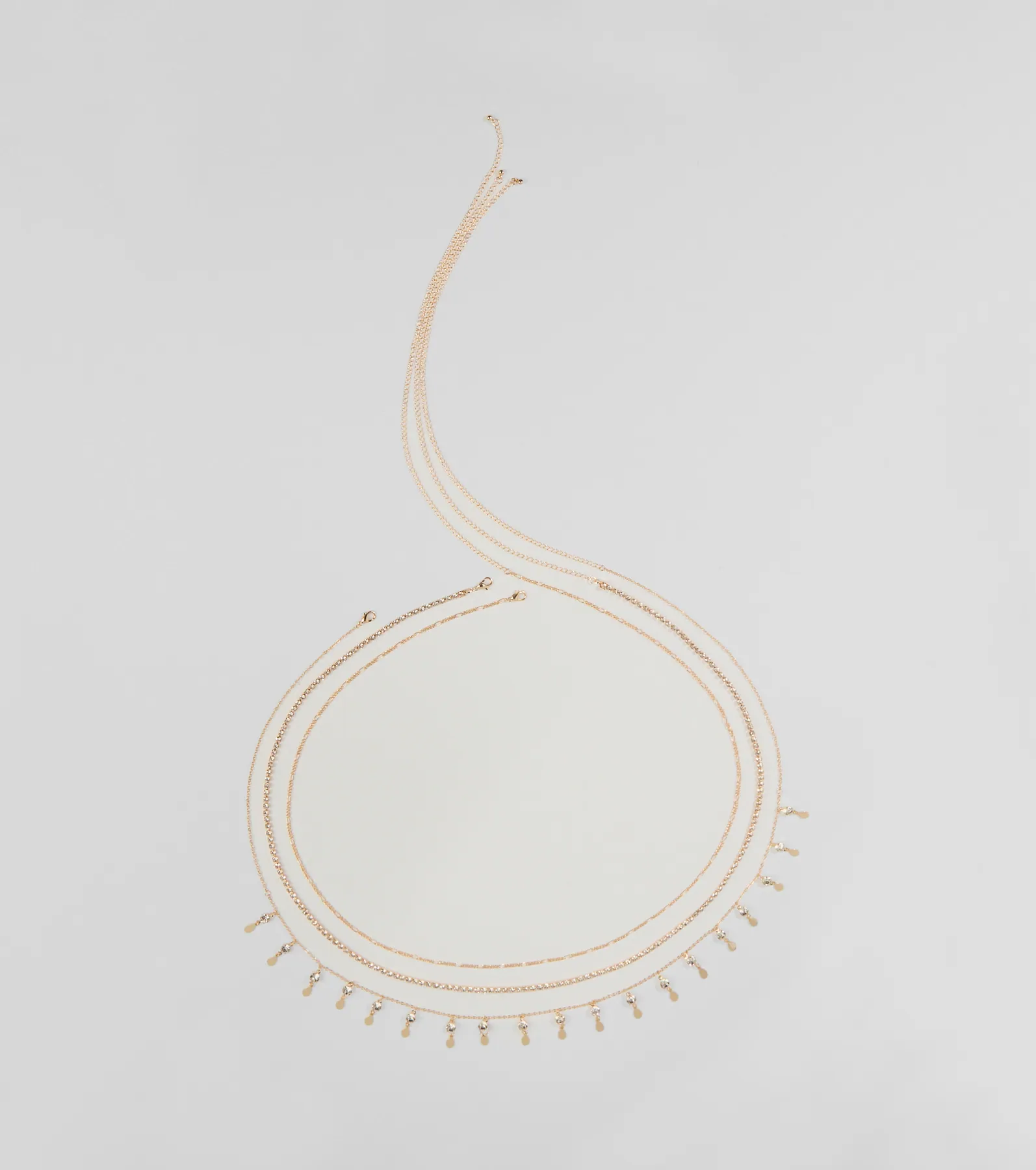 Adorn your look with this dainty and luxe layered belly chain featuring one chain with rhinestone and coin charms. one delicate chain. and one rhinestone chain each with lobster clasp closures. Style with a crop top and jeans.