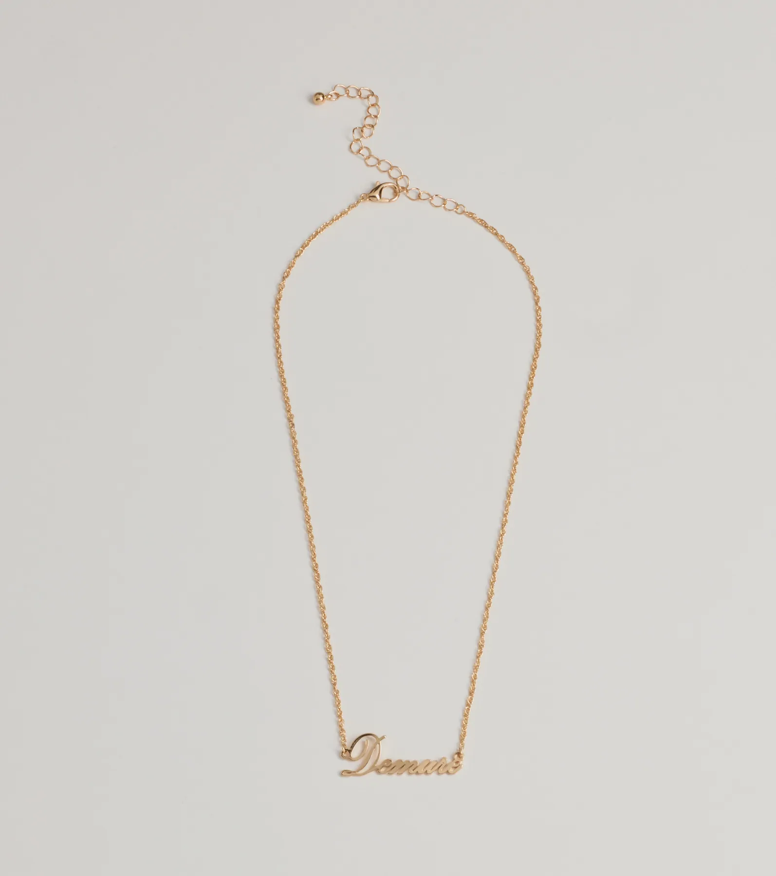 Keep up the trends in this dainty chain necklace with a script that reads "Demure" and is secured with a lobster clasp closure. Complete the look with a going-out dress.