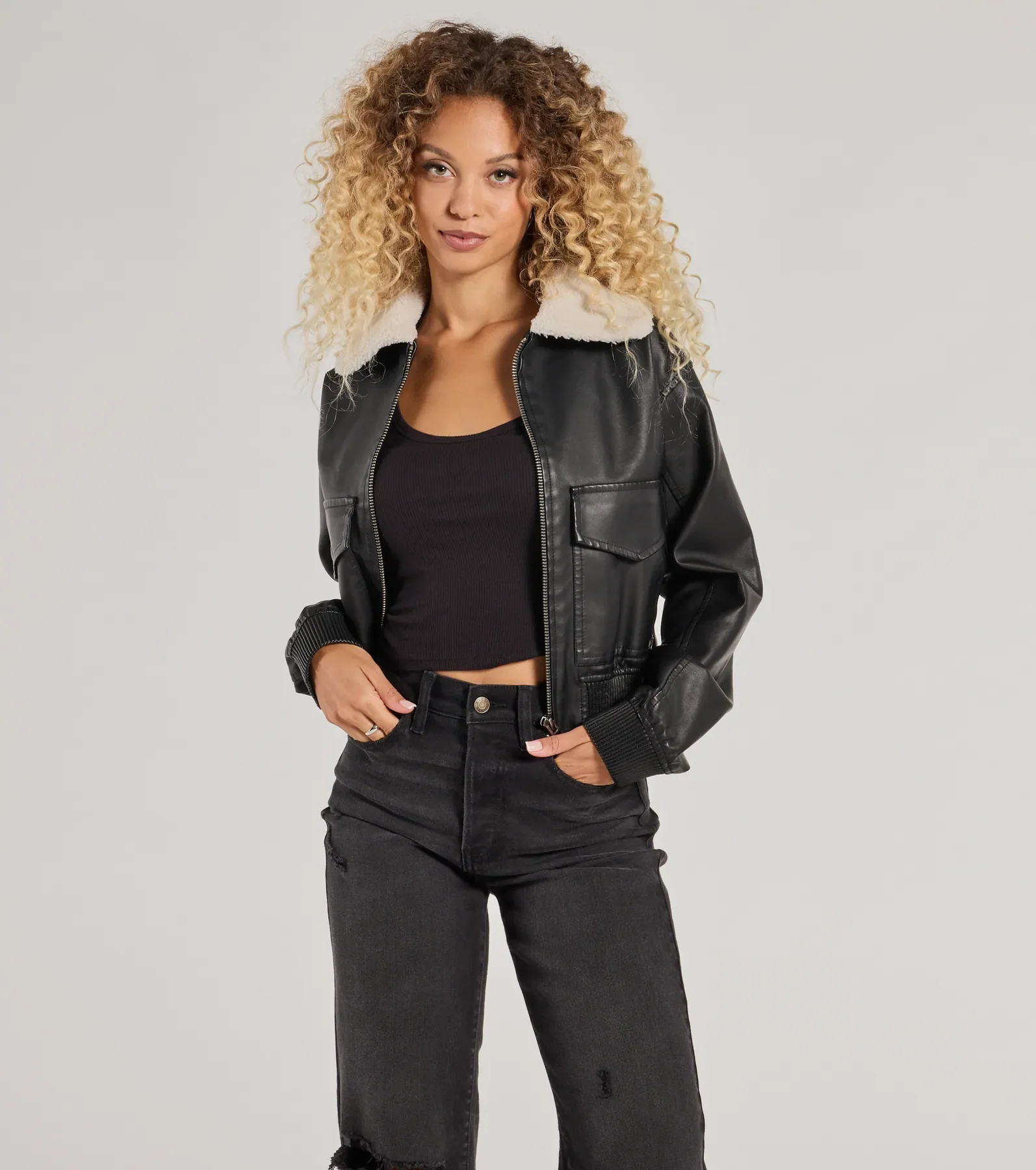 Standout from the crowd in this faux leather bomber jacket with a faux sherpa collar to give cozy vibes to your look. Pair with jeans.