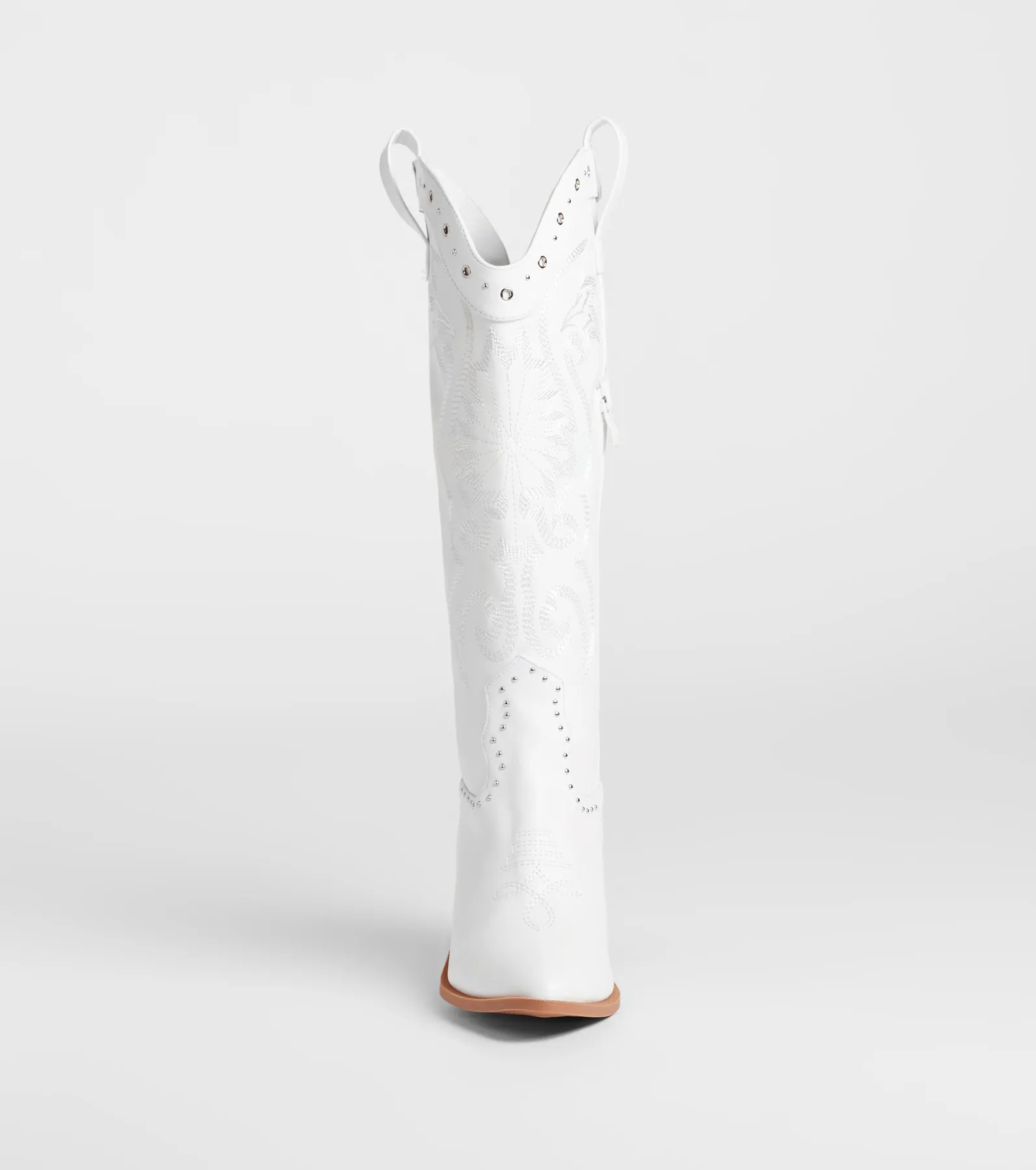 Add an edgy western vibe to your fave 'fits with these sleek studded cowboy boots. Designed with a pointed toe and a mid-shaft height. they feature an inner zipper closure for easy on-and-off styling.