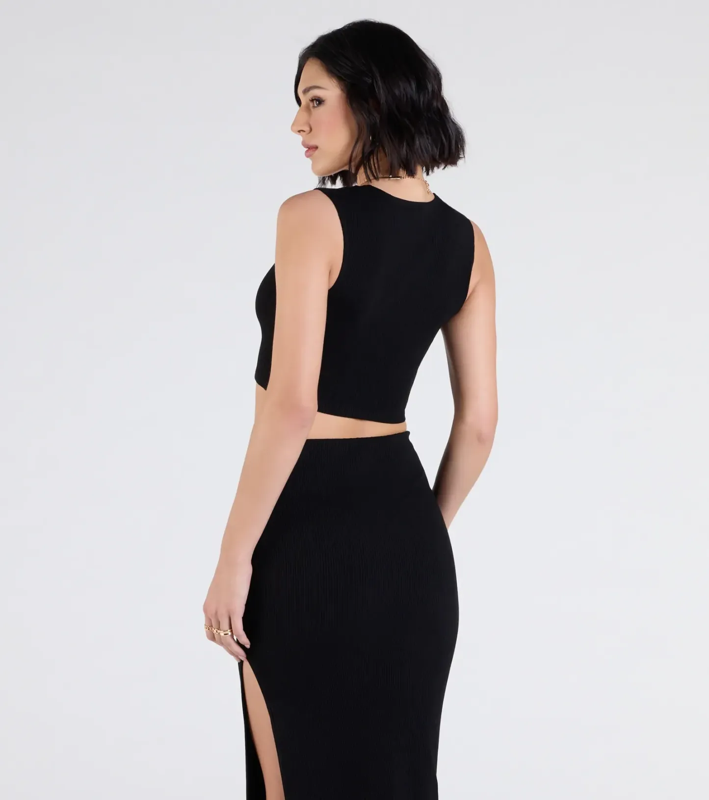 Enter your elevated era with this chic staple ribbed knit tank top perf for everyday styling. Designed with a sleeveless square neckline and fitted cropped hem. pair with the matching midi skirt for a seamless look.