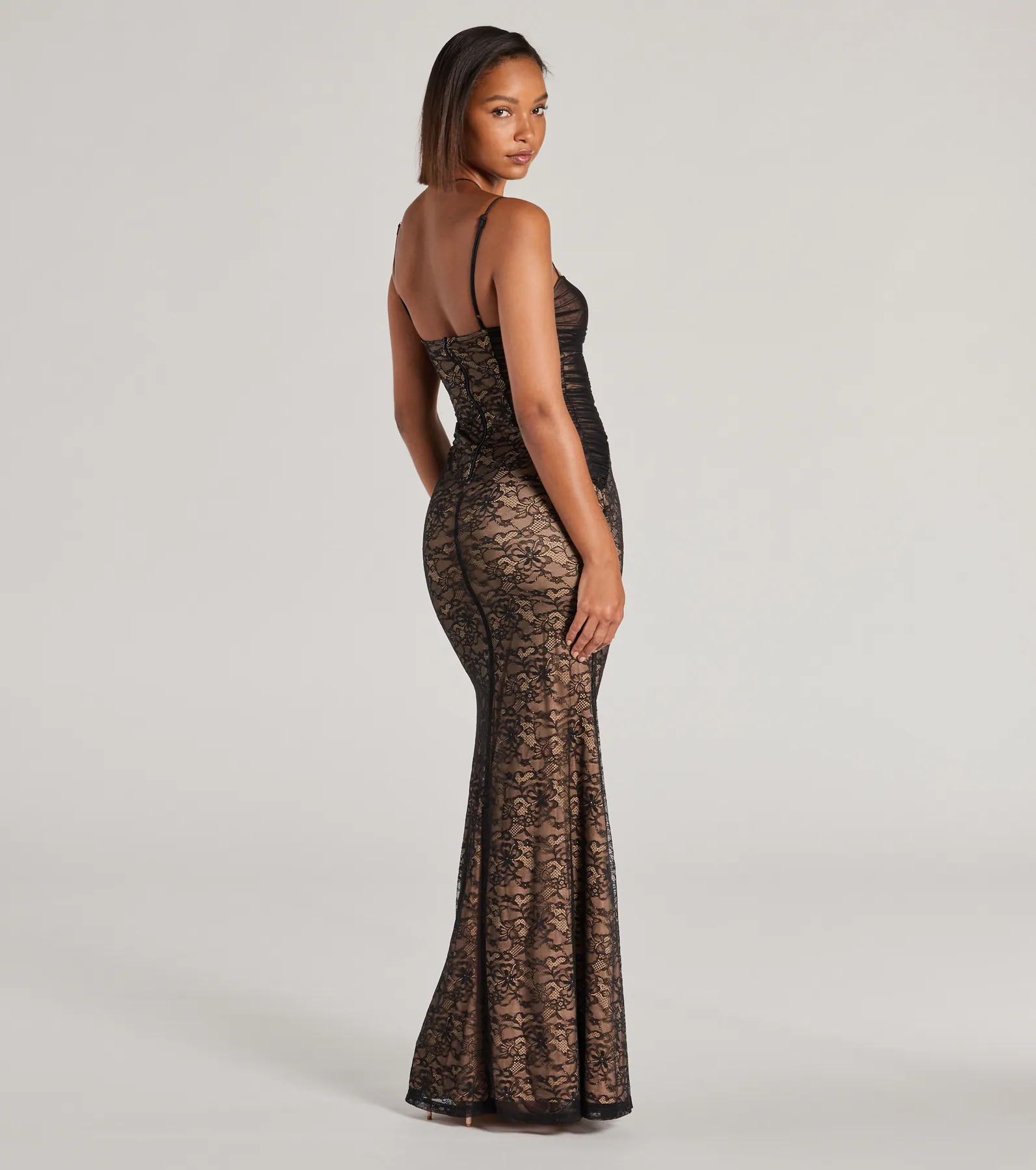 Fall in love with the Meg lace mesh formal dress on your big day or attending a black tie party. Featuring a flattering sweetheart neckline and adjustable spaghetti straps. this dress offers a sensual and elegant appeal. The mesh-lined padded bra cups and sides add support and enhance your figure. while the breathtaking mermaid silhouette and floor-length hem exude sophistication. Complete the look with earrings.