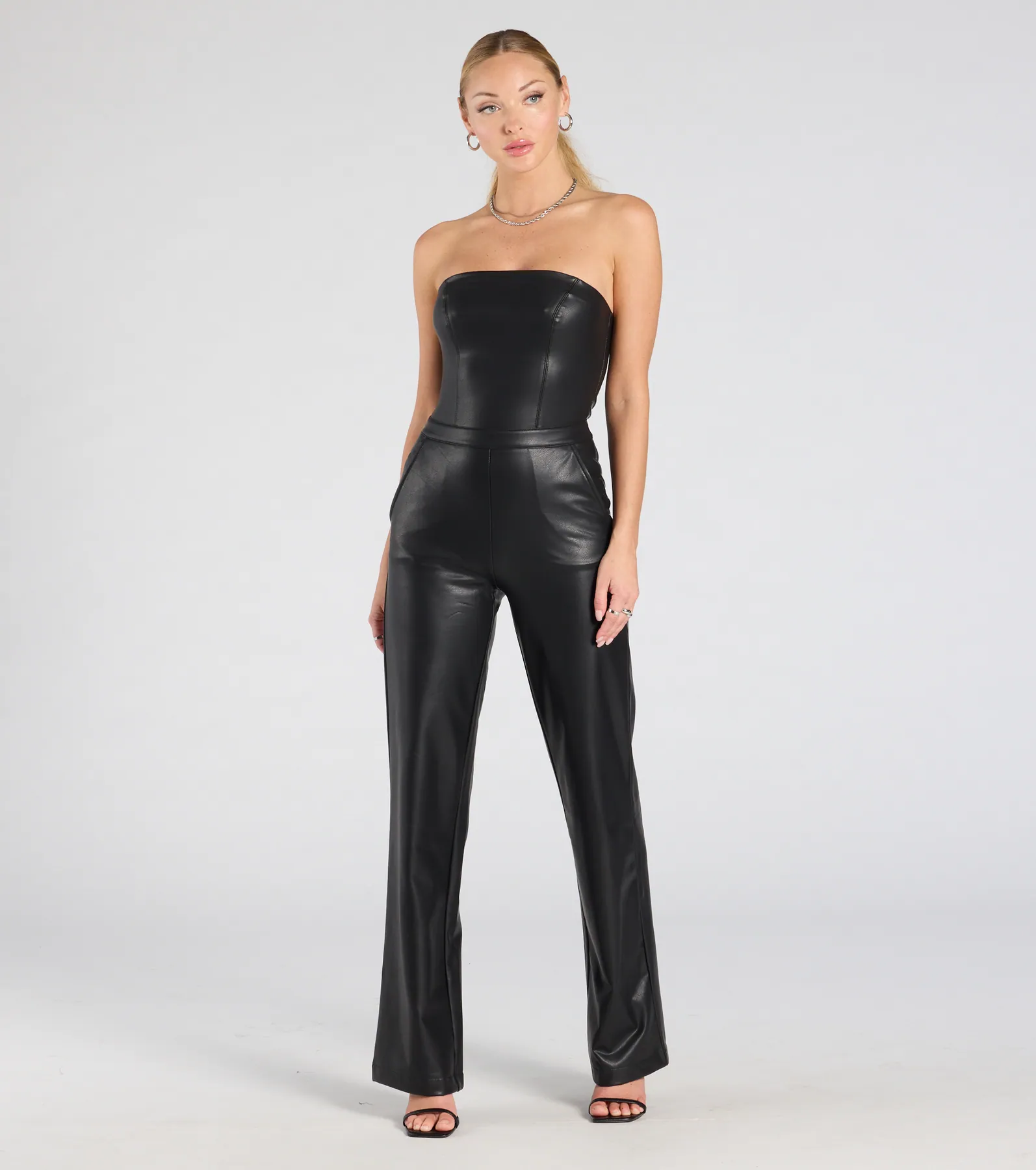 You won't be able to hide this faux leather jumpsuit for long! Strut your fashionista self in this jumpsuit featuring a fitted bodice and a flattering wide-leg silhouette. Pair with pointed-toe heels.