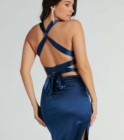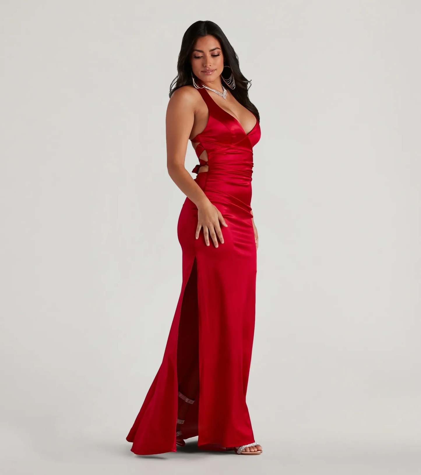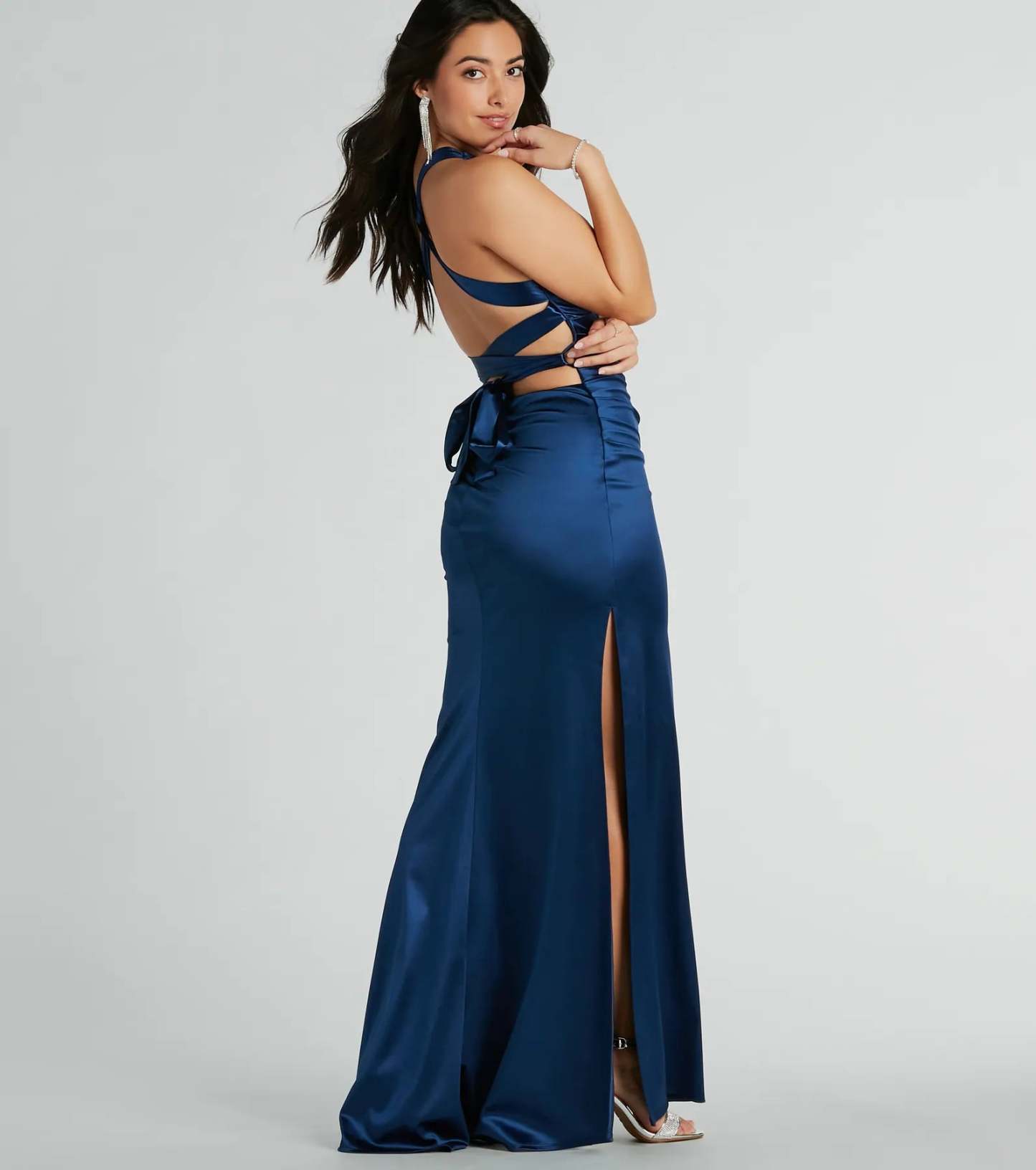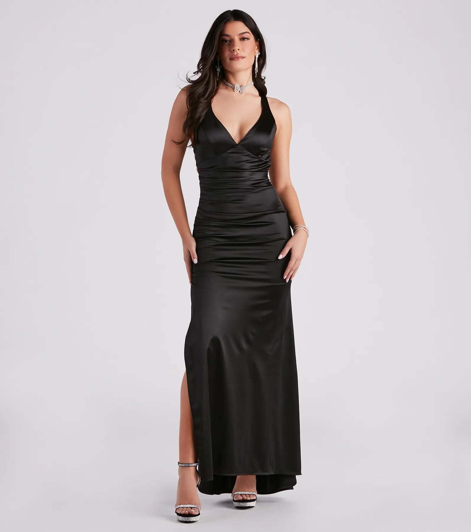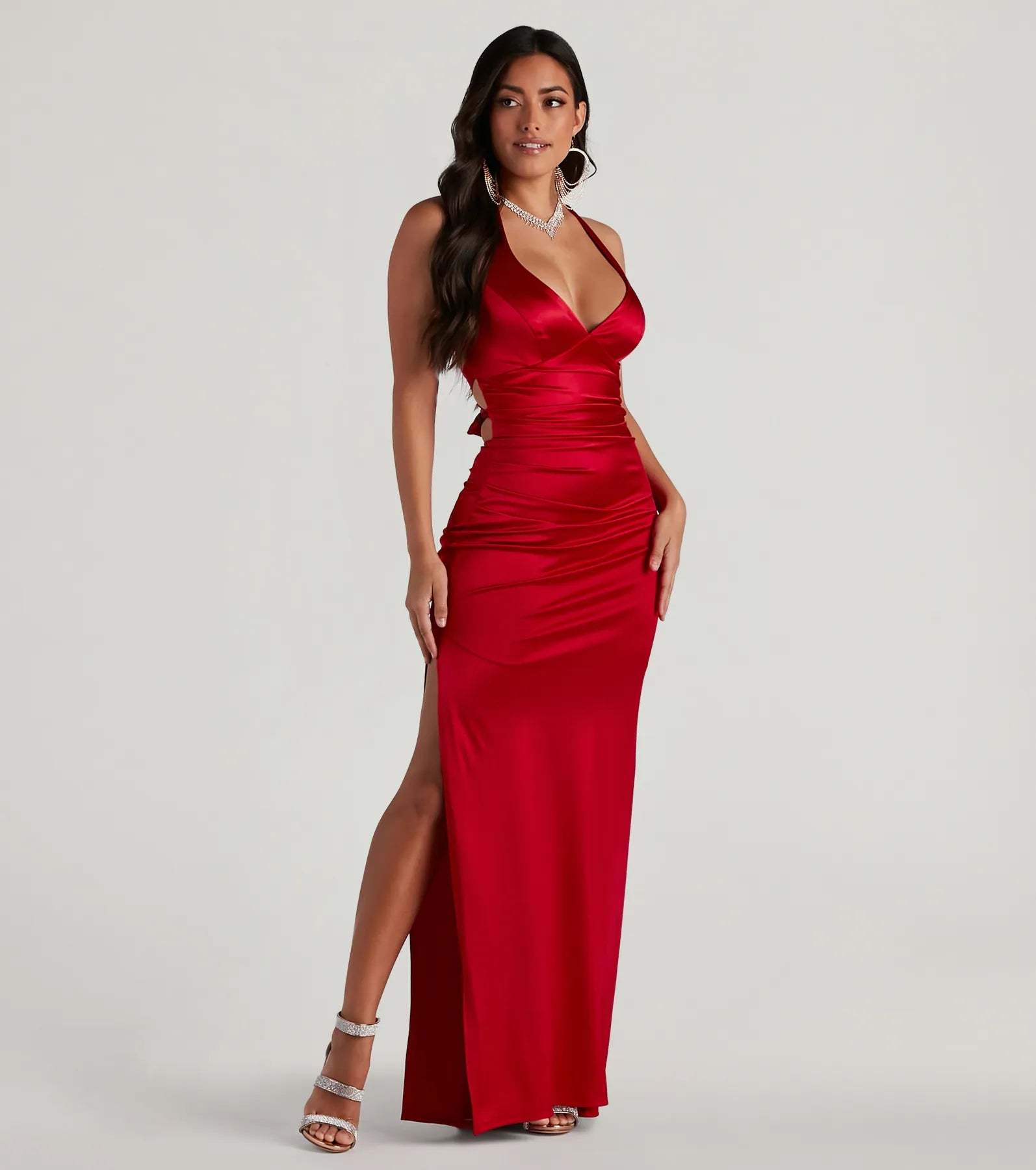 Slip into this silky satin number! Sam is here for you and your next dressy affair. She features a sleeveless, plunging V-neckline, a built-in padded bust, and wide shoulder straps that lead to her open-back design with lace-up straps, a zipper closure, and bum ruching. Her form-fitting, A-line silhouette hugs your curves while the side slit accent lets you showcase some leg on the floor-length hem. The formal dress is composed of a luxe satin-stretch fabric with lining. Complete the look with an elegant hair comb to tame your tresses in style.