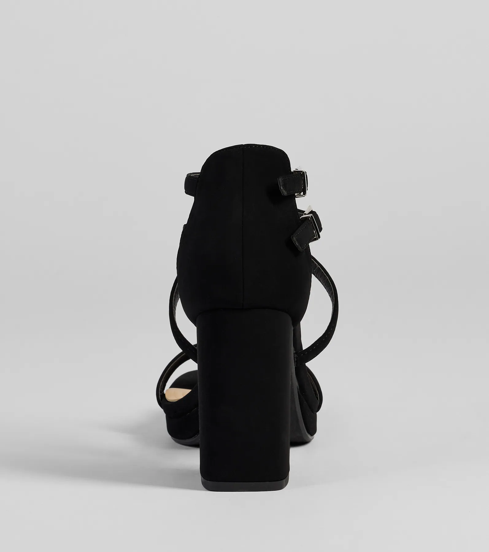 Slay every step in these chic platform heels designed with criss-cross straps and a tall block heel.