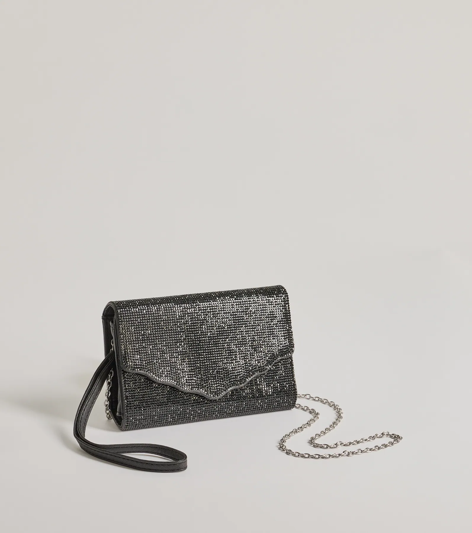 Sparkle with this must-have rhinestone crossbody wallet to keep your things in and outfit on point! The crossbody wallet features a detachable wristlet and chain strap. a front scallop trim foldover flap with snap-button closure. and a spacious metallic lined interior with plenty of pockets for cards. cash. and phone. Complete the look in gorgeous heels.
