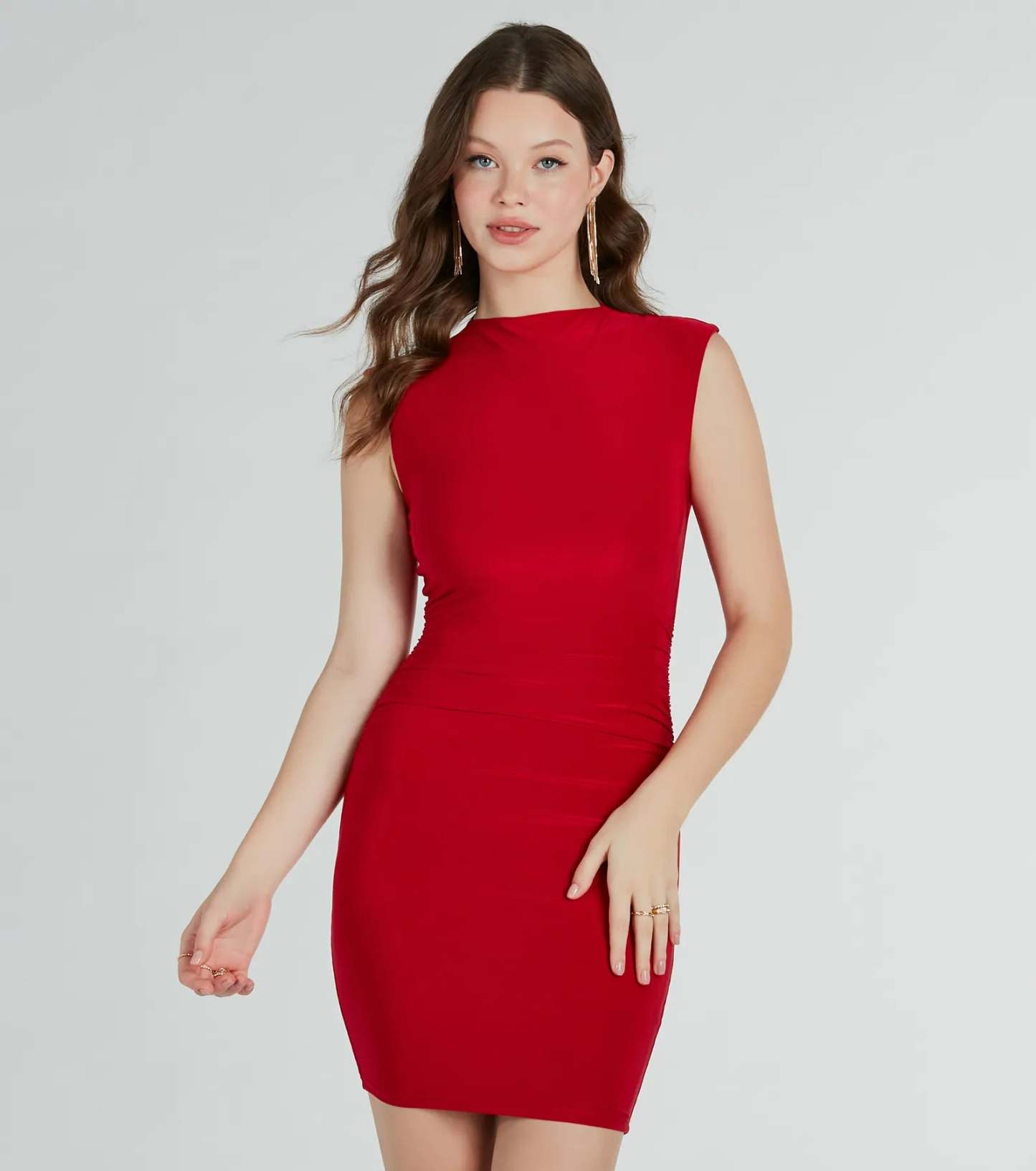 Keep your style on point with this simply chic bodycon mini dress. It features a sleeveless mock neckline, tank shoulder straps, ruching down the side seams to accentuate your curves, a mini-length hem, and a bodycon silhouette. The double-lined smooth knit fabric offers plenty of stretch for comfortable wear. Pair this short dress with strappy heels?to grab drinks!